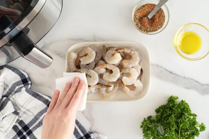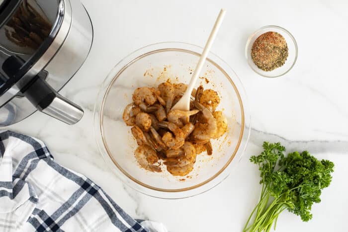 - Add the shrimp to the bowl and toss to cover the shrimp with the oil and seasoning mix.