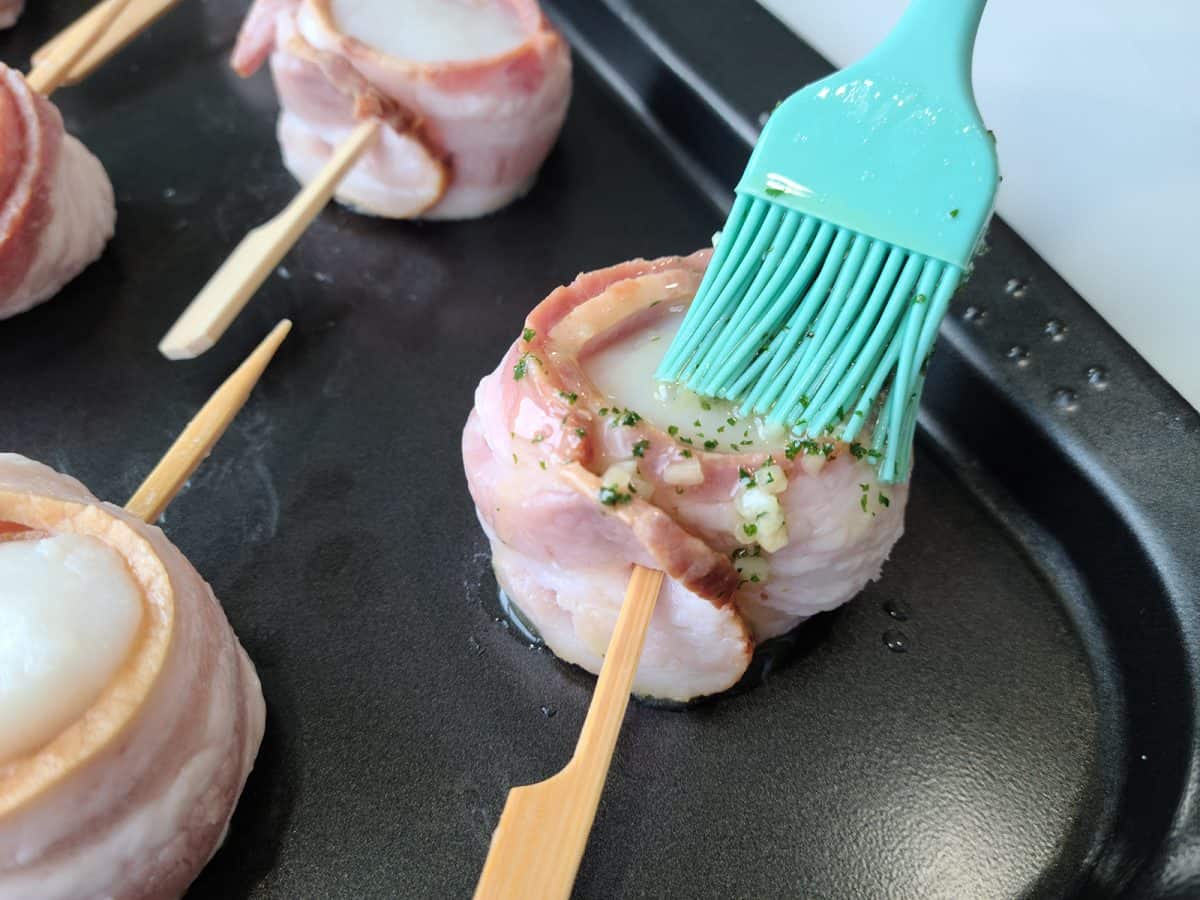 - Tools For This Recipe: You will need toothpicks or small skewers, a medium-sized bowl, a microwave-safe dish, a small bowl for the garlic butter sauce, a pastry brush for coating the scallops, and a large baking sheet.