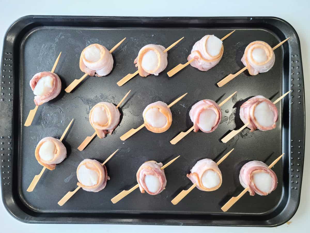 - Secure the bacon around each scallop with a toothpick or bamboo skewer pushed through the middle.