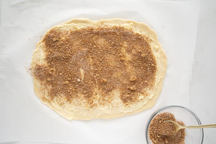 - Sprinkle the cinnamon-sugar mixture over the butter evenly. Sprinkle raisins on top if desired.