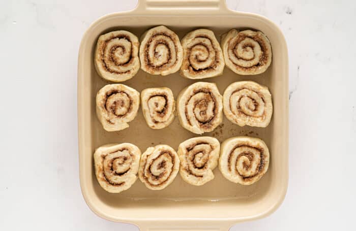 - Place into the prepared 8×8 pan, doing three rows of four buns.