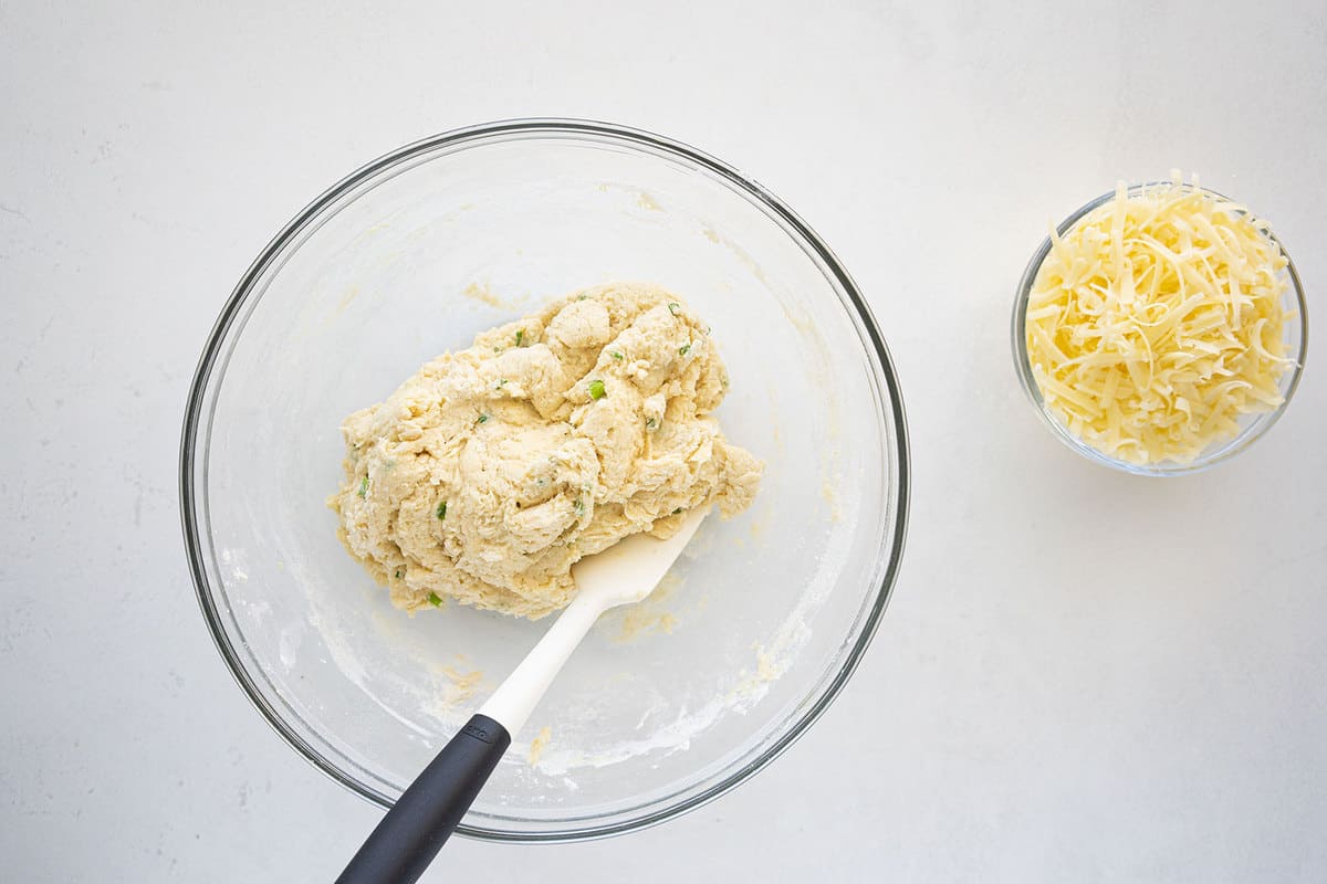 - Stir into the dry mixture until just combined, then add in the cheese.
