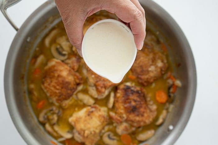 - Stir in the wine and deglaze the pan by scraping all the brown bits off the bottom of the pan, making sure that the flour is also not clumping and mixes in. Once done, stir in the chicken broth.