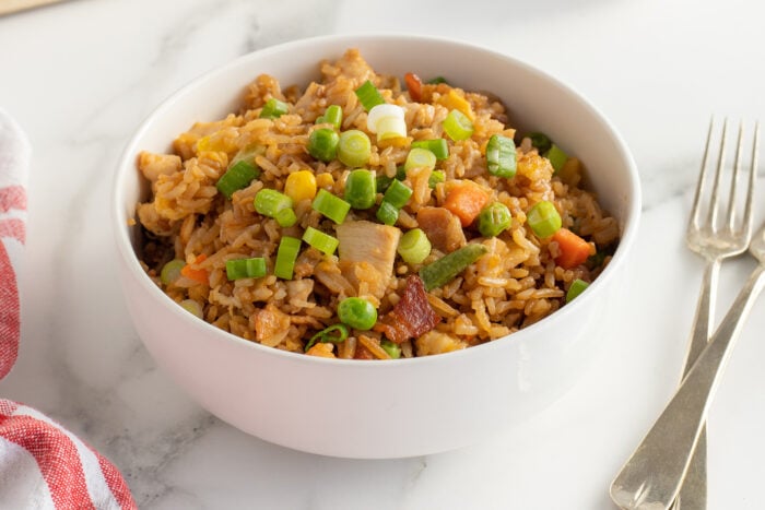 This not only helps boost the protein content of the whole meal, but that little bit of extra egg, fat, and liquid gives each bit of rice an absolute ton of juiciness and tenderness.