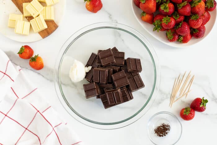 - Insert a toothpick into the stem end of each strawberry. Ensure each strawberry is perfectly dry. Hold a strawberry by the toothpick or by the leaves, and dip it into the chocolate mixture, covering about 2/3 of the strawberry.