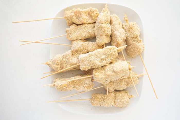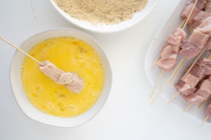 • Take each skewer and coat with breadcrumbs, then egg mixture, and then repeat one more time.