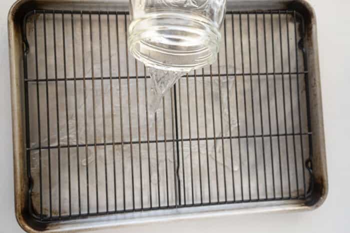 - Pour 2 cups of chicken broth into a 9×13-inch casserole / rimmed baking sheet with a wire rack inside, and set aside.