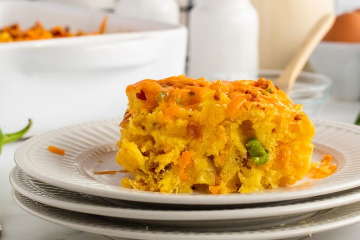 Freezer: Freezing this cornbread casserole couldn’t be simpler! Just wait for the cornbread to cool completely before slicing it and portioning it, then store individual slices in an airtight container or zip top bag in the freezer for up to 3 months. When you’re ready to eat it, let it defrost in the fridge for at least 24 hours, then reheat it in the microwave in 10 second intervals or toast it in the oven for 10 minutes at 350°F for a little extra crisp!