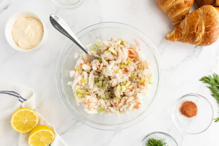 - Pour the mayonnaise mix over the crab and toss gently to coat.