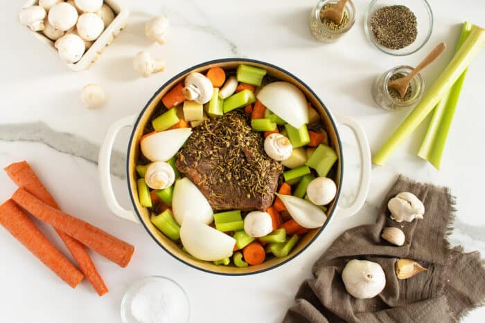 Vegetables: The staple vegetables to cook with a roast are usually onions, potatoes, carrots, and celery. We’ve added mushrooms for this one, and you can add basically any root vegetable. Beets, squash, sweet potato, parsnip, and turnip all work well with roasts. You can also throw in something a bit more flavourful, like fennel or celeriac. The more colors and shapes you’ve got in there, the better the meal will look and the more nutrients you’ll be loading up on.