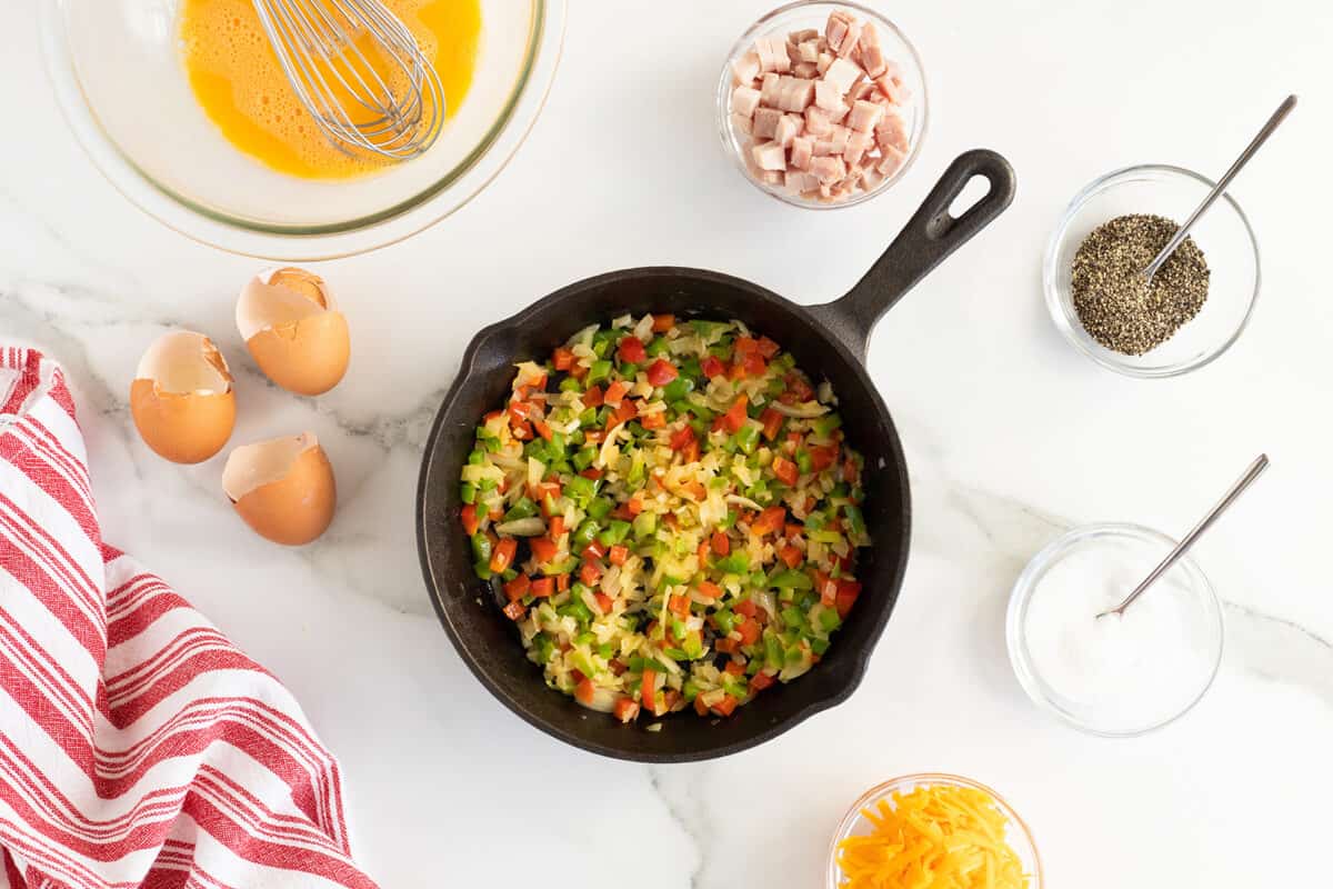 - Pour beaten eggs over the ham and vegetables. Turn burner to low and cover skillet with a lid. Cook for 4-5 minutes, until eggs are solid and mostly cooked.