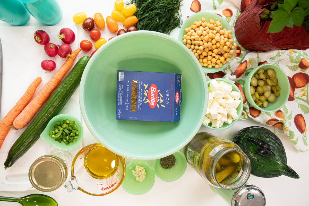 How To Make Dill Pickle Chickpea Orzo Salad