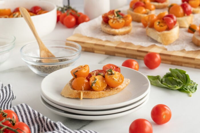 - Variations: For fun variations on the bruschetta theme, try seasoning your tomatoes with zaatar, a Middle Eastern spice blend with gorgeous herbs and citrusy sumac! You can also add a creamy element—like a smear of ricotta or a slice of fresh mozzarella on your bread—if you’re not too fussed about tradition!