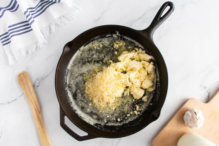 • Add in the cream cheese and grated parmesan cheese and melt