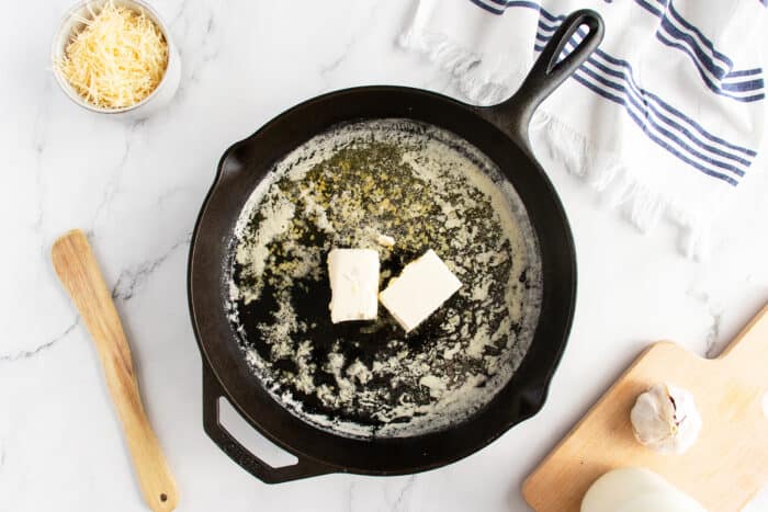 - In a large skillet, melt the butter and fry the garlic in it until browned.