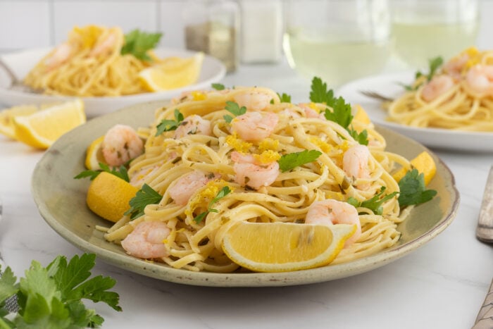 • Toss the pasta and the shrimp in the homemade garlic butter sauce, squeeze the lemon over the top and garnish with the parsley and then serve