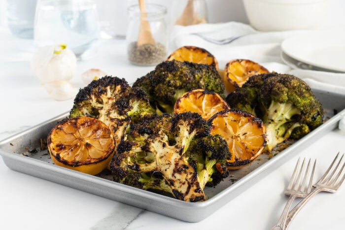 The best way to grill broccoli is to leave the very delicious and healthy stems on and grill it in one flavor-packed piece! Serve with grilled lemons for the perfect grilled veggie side dish!