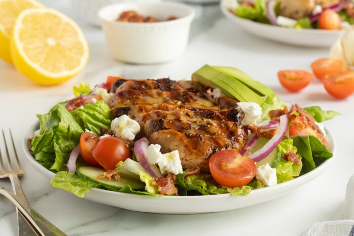 • Place the grilled chicken breast on top and your toppings placed around the tomatoes, sliced cucumber, bacon, cheese, red onion, and avocado