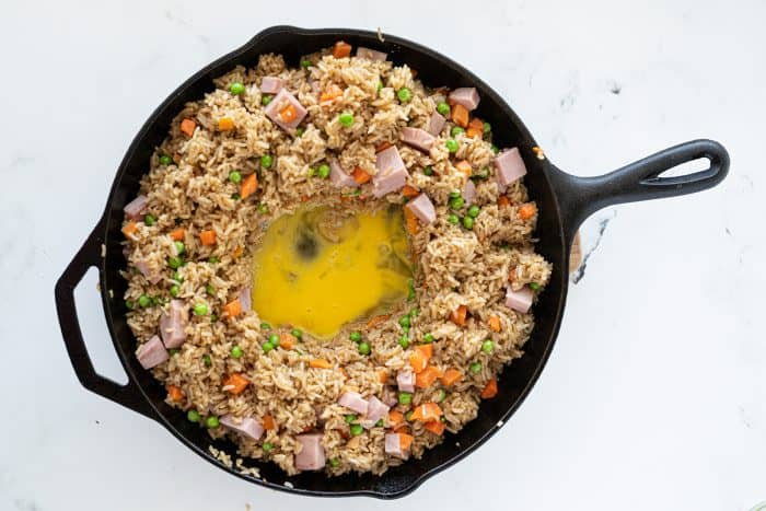 - To make your eggs, instead of making it in a separate pan, just make a little well in the center of your rice mixture. Push everything to the side with your spatula and pour your eggs into the middle. Fry them gently until they scramble to your preferred level of doneness. Remember that it will continue to cook for a little while on the plate.