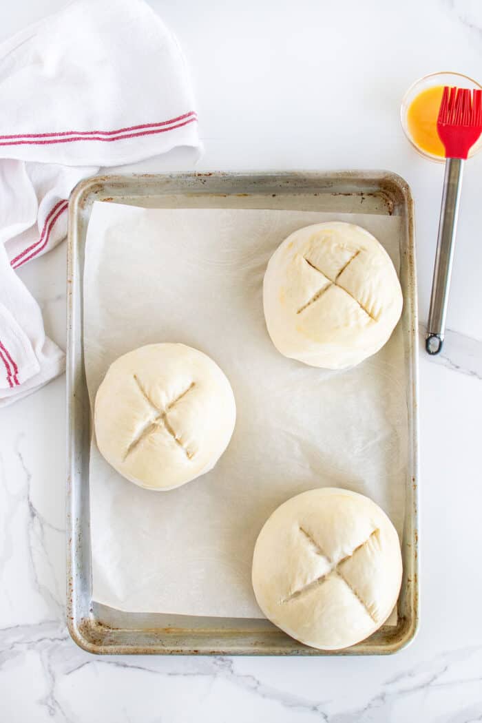 - Prepare the egg wash and use a pastry brush to brush each dough ball with egg wash. Using a sharp knife, score an X into the top of each dough ball.