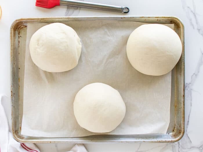 - Line 2 large baking sheets with parchment paper. Place 3 dough balls onto each in staggered positions (two at the top sides and one in the middle bottom). Spray some plastic wrap with baking spray and set on top of the dough lightly.