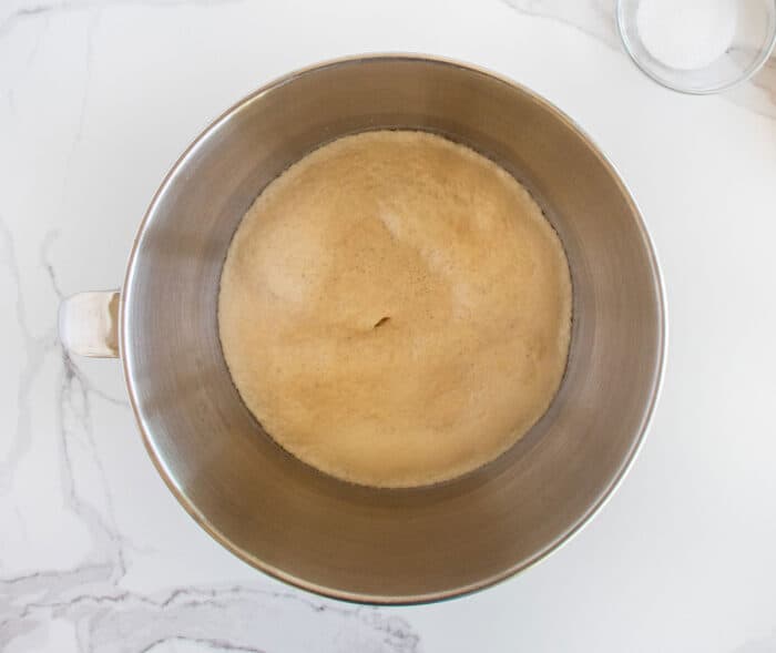 • Mix on medium speed until combined, and then let sit for around 10 minutes, or until the yeast mixture starts to bubble