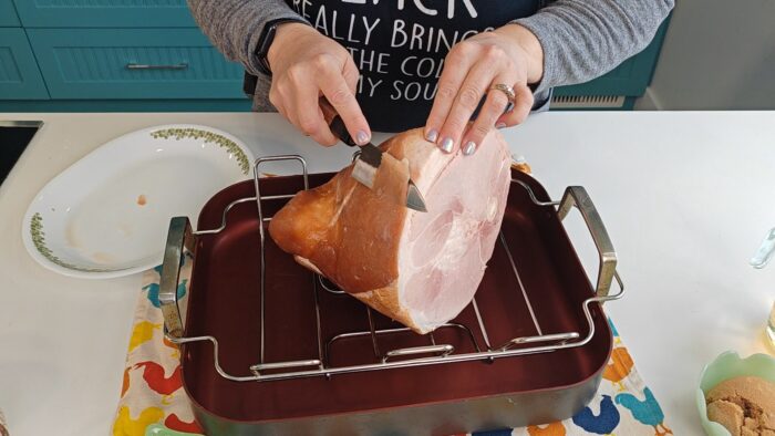- Using a sharp knife, make shallow diagonal cuts across the surface of the ham. Each cut should be about 1/4 to 1/3 inch deep and spaced about one inch apart.