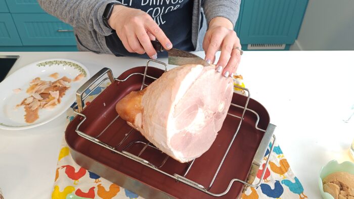 - If you have a ham with a thick rind and lots of fat, like a ham shank, remove the rind before scoring. Do not remove the skin if there is only meat beneath it.