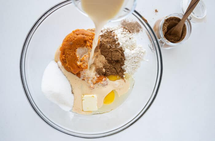 • Combine the canned pumpkin, Bisquick, sugar, evaporated milk, butter, pumpkin pie spice, vanilla extract, and eggs until completely smooth and blended together