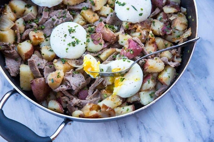 This is a fabulous way to use leftover prime rib roast! Add a few diced fresh herbs to the hash and it’s damned near a perfect meal. One of my all time favorites.