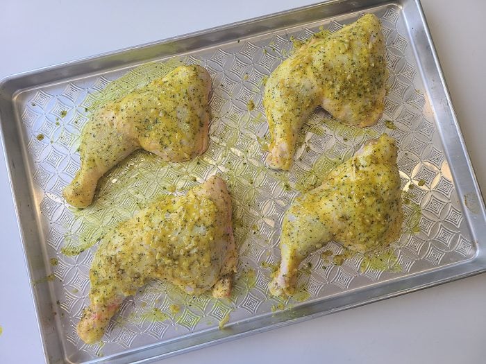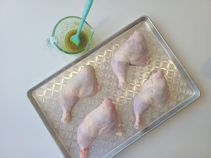 - Pat the chicken quarters dry with a paper towel and place on a baking sheet.