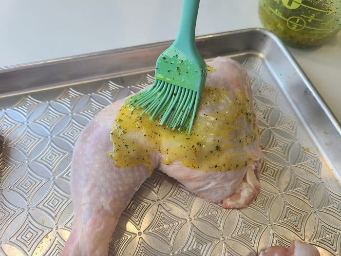- Brush the butter sauce over each chicken quarter, covering completely.