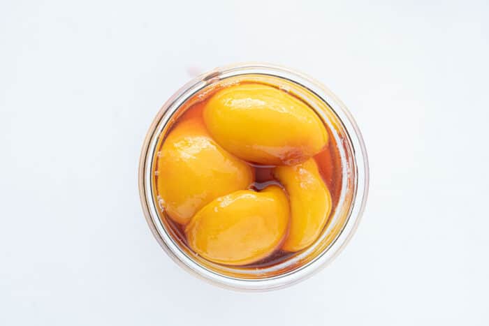 - Place the cooled syrup and peaches together in a container and store in the refrigerator overnight if possible. If not, store in the syrup for as long as you can.