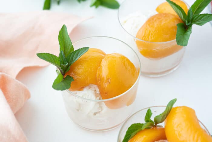 - To serve, for each serving place a large scoop of ice cream in a sherbet glass. Place two peach halves on top, then drizzle with raspberry sauce.