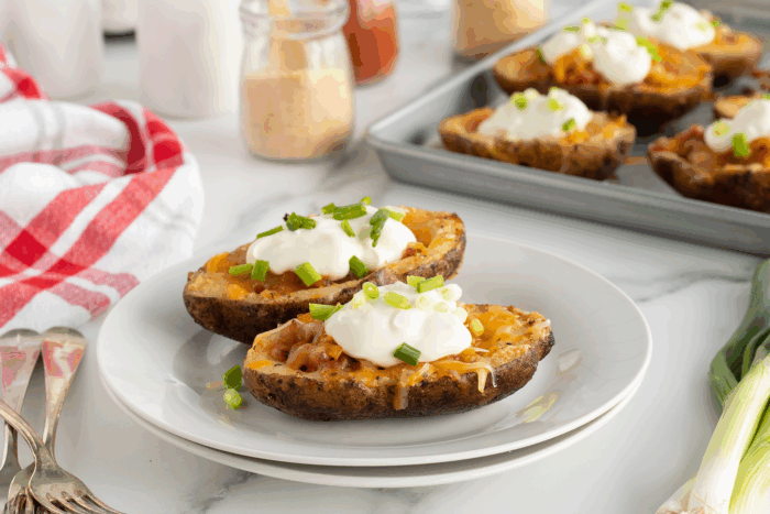 Freezer: Freeze hollowed-out, unstuffed baked potato skins on a baking sheet so they don’t stick together, then toss them into a freezer bag and keep them on ice for up to 6 months! When you’re ready to eat them, just put them on a baking sheet straight from the freezer, load them up, and bake as instructed below!