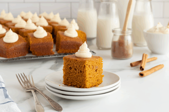 Freezer: It’s best to freeze your pumpkin squares before you frost them. After baking, allow the cake to cool completely then wrap it tightly with cling film and foil, or sealed in a zip-top bag—you can either pre-slice the cake or leave it whole, depending on how much space you have on hand. When you’re ready to eat, let the frozen squares thaw overnight in the fridge, then frost the thawed cake and cut it into squares to serve!