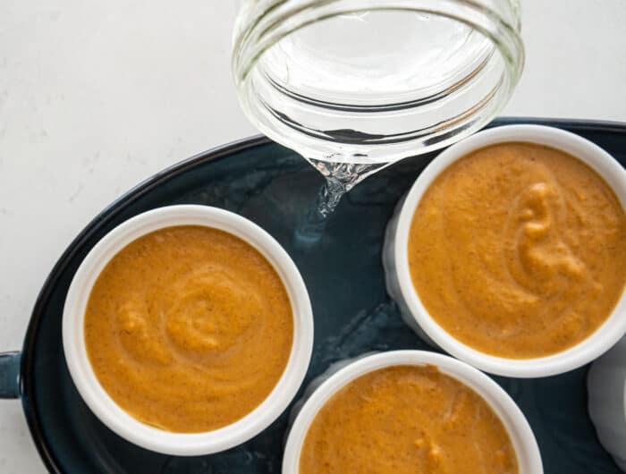 - Carefully pour hot water around cups until there is an inch of water in the pan.
