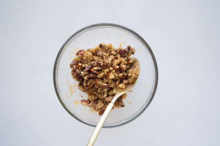 - For topping, combine the brown sugar, pecans and butter together until combined.