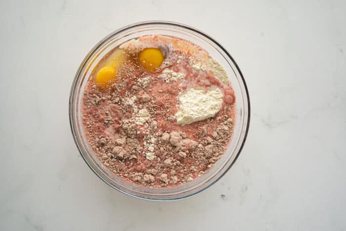 • Combine all of the ingredients into a large bowl, mixing until all the lumps disappear