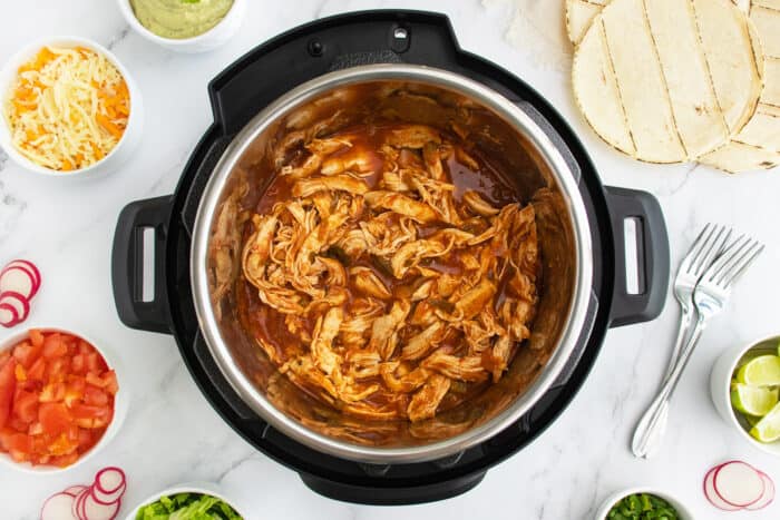- Remove and place into a bowl. Serve the chicken in the tortillas with desired toppings.