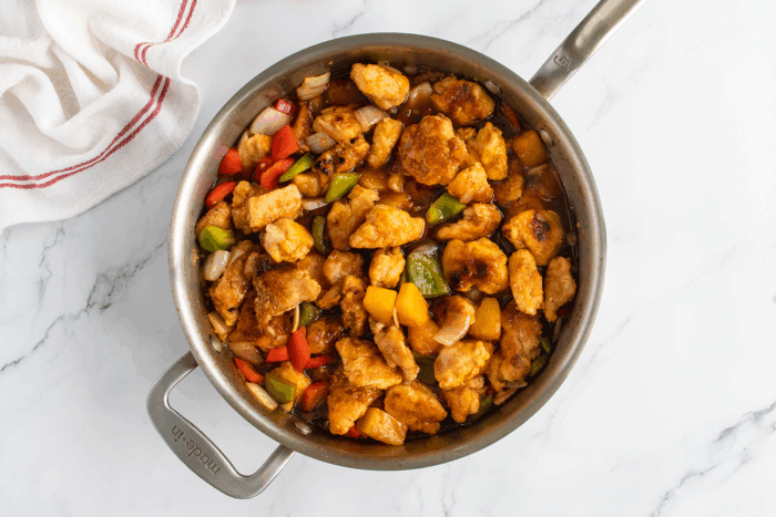 - Add the onion, bell peppers, and drained pineapple to the skillet you used to cook the chicken and cook together for 2-3 minutes, or until the desired tenderness is reached. Add a tablespoon of oil if needed. Pour the sauce over the cooked vegetables and bring to a simmer. Add the cooked chicken to the pan and stir gently to coat everything evenly. Serve over rice if desired!