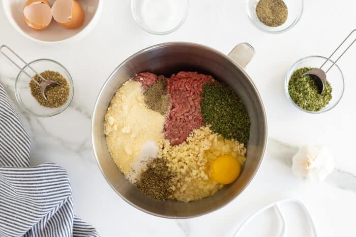 You can also think about combining different types of meat together – a common combination is 50% beef mixed with 50% pork, to produce a juicy, super savory meatball.