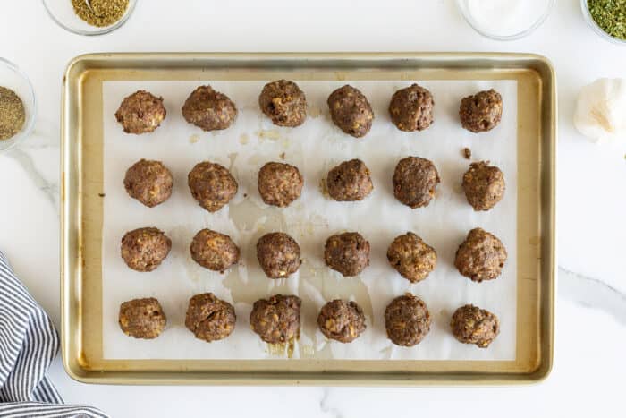 Roll the meatballs out into whatever size you want, and then get them ready for cooking, either in the oven or in a pan.