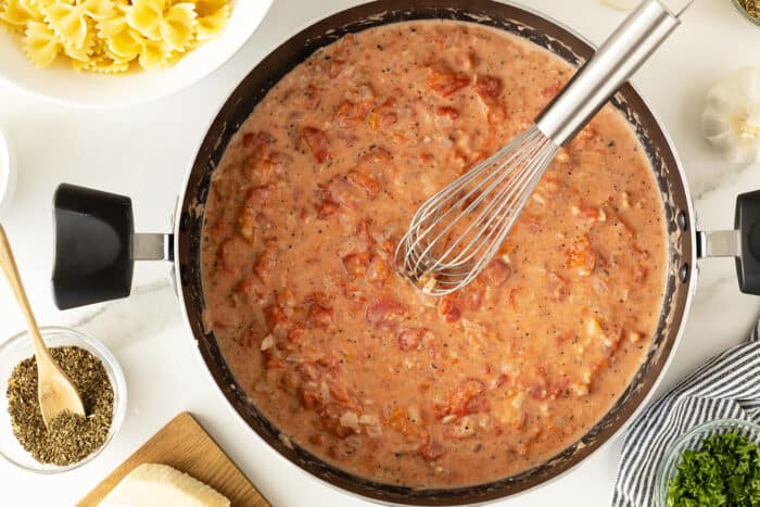 - Whisk in the canned tomatoes (undrained, liquid and all) and bring to a simmer. Cook on a low simmer while you prepare your pasta., stirring occasionally.