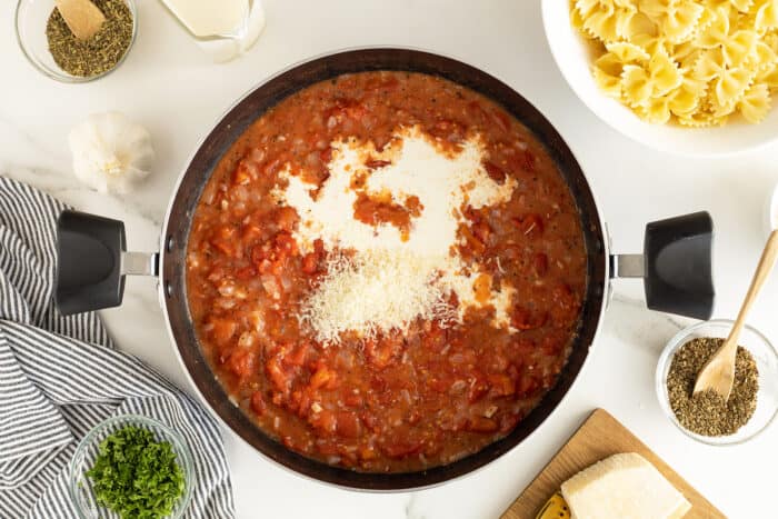 - Remove the sauce from the heat. Whisk the cream and the Parmesan cheese into the sauce until combined. Season with salt and pepper to taste if desired.