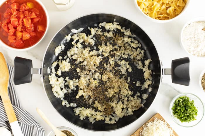For example, you really want to make sure that your onions are totally cooked and ready before adding the tomato sauce. If you don’t, what will happen is that the acidic, cold tomatoes added to the onion mixture, not only will the difference in temperatures halt the cooking process, but it will also stop it from browning or developing any tasty flavors.