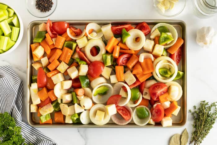 - In a large bowl add the onions, tomatoes, carrots, green peppers, and turnips and drizzle with olive oil and stir well to ensure well coated. Place veggies onto a large baking sheet.