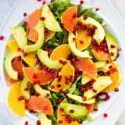 Place the arugula leaves on a large platter. Top with the fruit. Drizzle the dressing over the top. I then use salad tongs to divide between two or three plates.